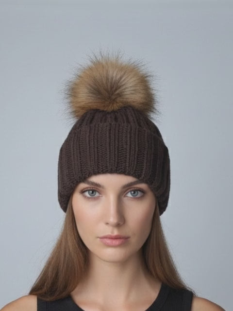 Köstliche klassische braune Strickmütze mit Fellquaste. Lässt sich problemlos mit den meisten Winterklamotten kombinieren und hält Ihren Kopf in den kalten Monaten auf jeden Fall warm. Die Mütze ist mit einem superschönen Bommel aus Waschbärfell gestylt.
