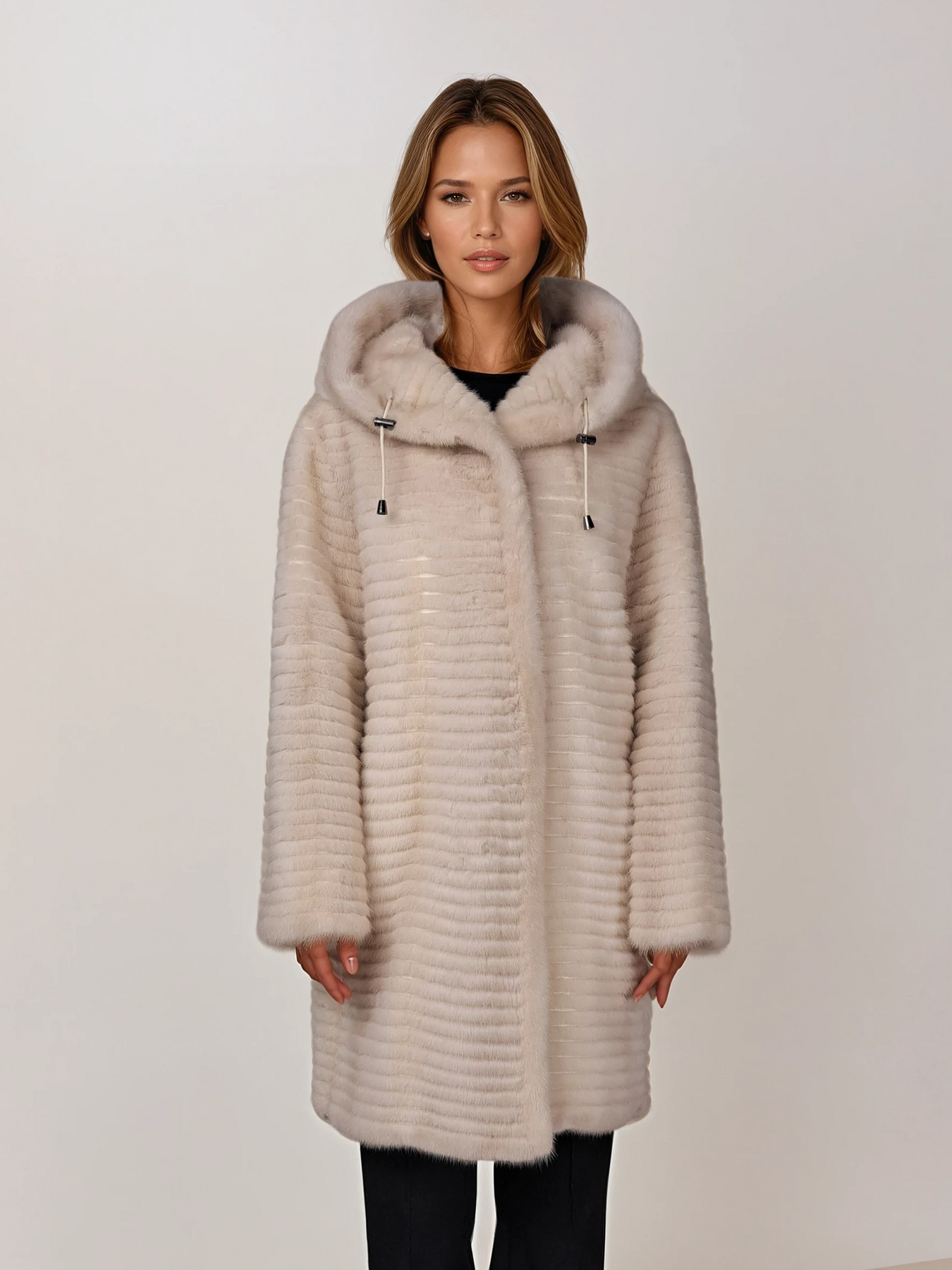 Norma, 90 cm. - Hood - Mink - Women - Pearl Embrace timeless elegance with this generously proportioned hooded jacket, crafted in luxurious mink with a pearl finish. The interior tie band at the waist provides effortless adjustment, allowing you to shape the silhouette to your preference while maintaining a polished appearance. At 90 cm, this piece offers substantial coverage and a commanding presence, perfect for layering or wearing as a statement outerwear piece. The hood adds versatility and refined protection. A sophisticated choice for the woman who values quality construction and understated luxury in her wardrobe.