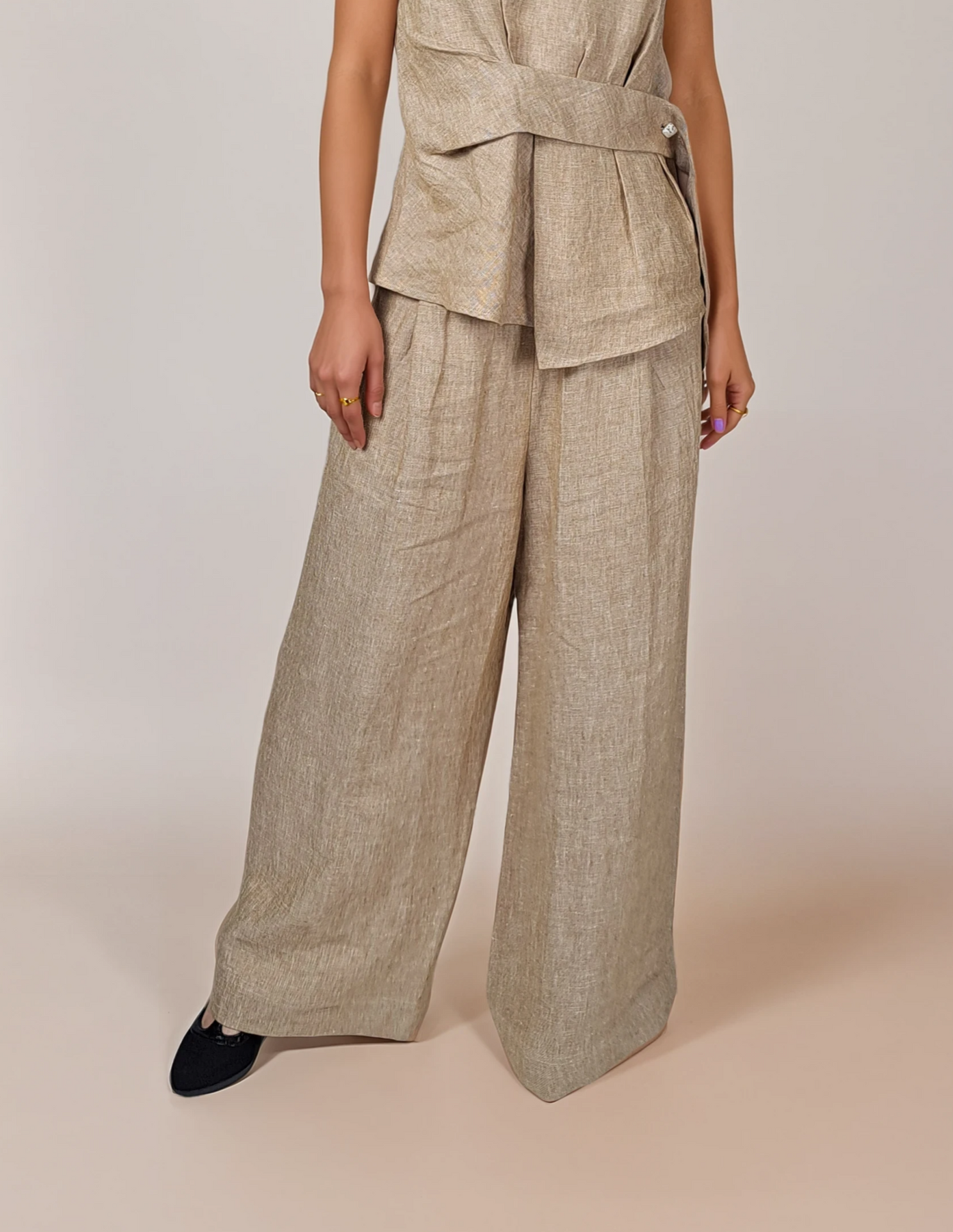 Oplev tidløs elegance med disse kamelgule hørbukser lavet af økologisk bomuld. Designet med en afslappet pasform tilbyder de ubesværet komfort, mens de bevarer en raffineret silhuet. Perfekt til varme dage, det åndbare stof sikrer, at du forbliver kølig uden at gå på kompromis med stilen. Løft din garderobe med disse alsidige bukser, der blander naturlig tekstur og sofistikeret lethed problemfrit.