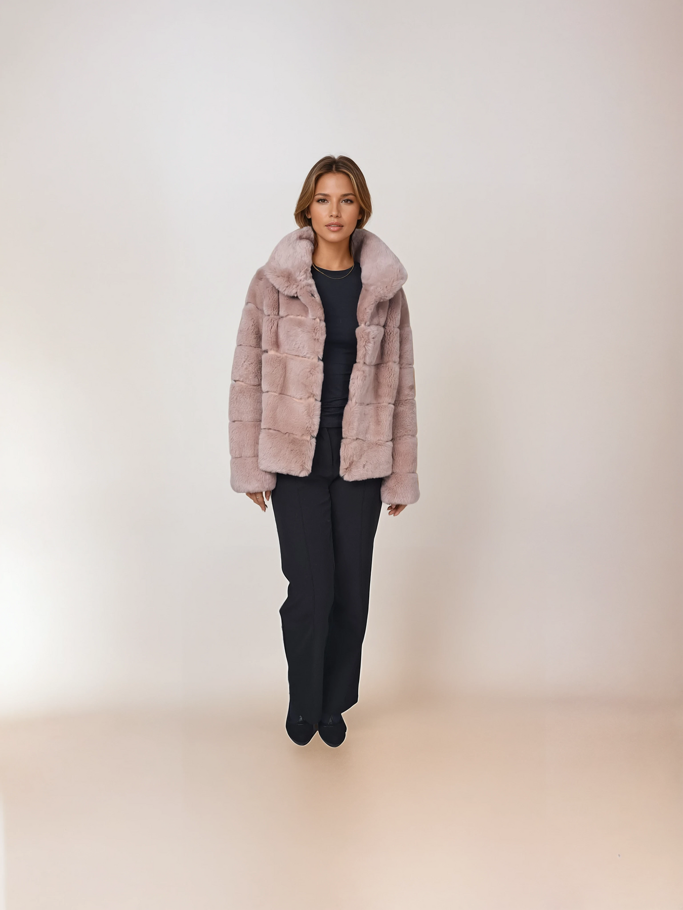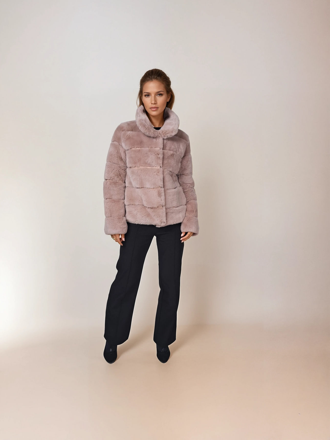 Stampe Denmark introducerer Petrovski, 60 cm., krave Rex frakke til kvinder i sort – en perfekt blanding af pænhed, klassisk stil og sporty sofistikering. Denne korte frakke er lavet af smuk støvrosafarvet rex-kaninpels og er designet til at holde dig varm hele vintersæsonen.
