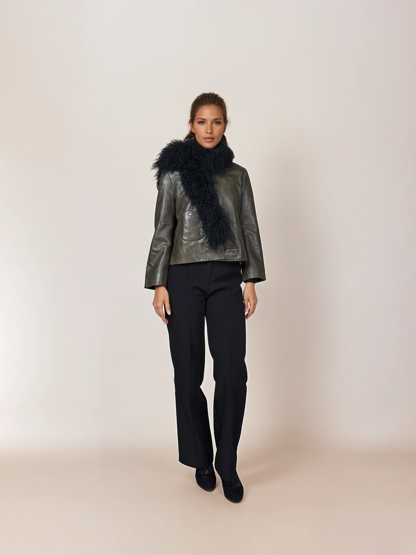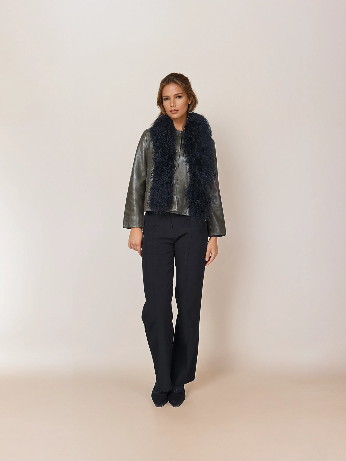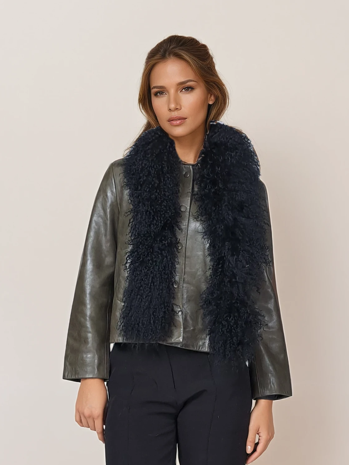 This kalgan lamb collar brings refined elegance to your neckline. Rendered in black, it offers a versatile neutral that complements any palette. The luxurious material drapes gracefully while providing subtle warmth and texture. Whether styled as a statement piece or layered beneath jackets, this sophisticated accessory adds understated luxury to both casual and formal ensembles with timeless appeal.