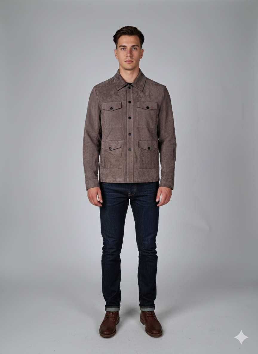 Denne Levinsky gede-ruskindsskjorte og -jakke er den perfekte kombination af afslappet stil og sofistikeret komfort. Jakken er lavet af premium gederuskind og er designet uden indvendig foring, hvilket gør den utrolig let og åndbar til ubesværet brug. Det bløde, smidige materiale giver en naturlig drapering og en luksuriøs følelse mod huden.