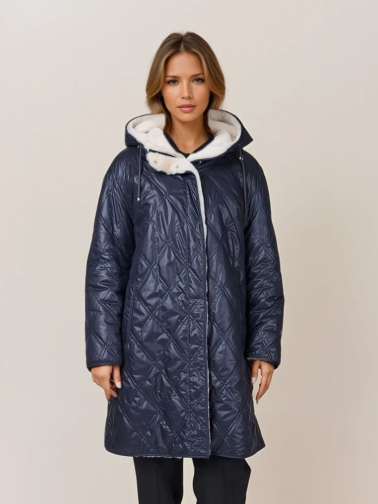 Stay warm and stylish with this reversible Gernsey parka-style jacket. Crafted from a high-quality lamb fur and fabric, this hooded jacket is designed to keep you comfortable in all weather conditions. Featuring a zipper and push buttons closure, as well as two side pockets for added convenience, this 90 cm long top is finished off with a layer of fluffy white lamb fur.