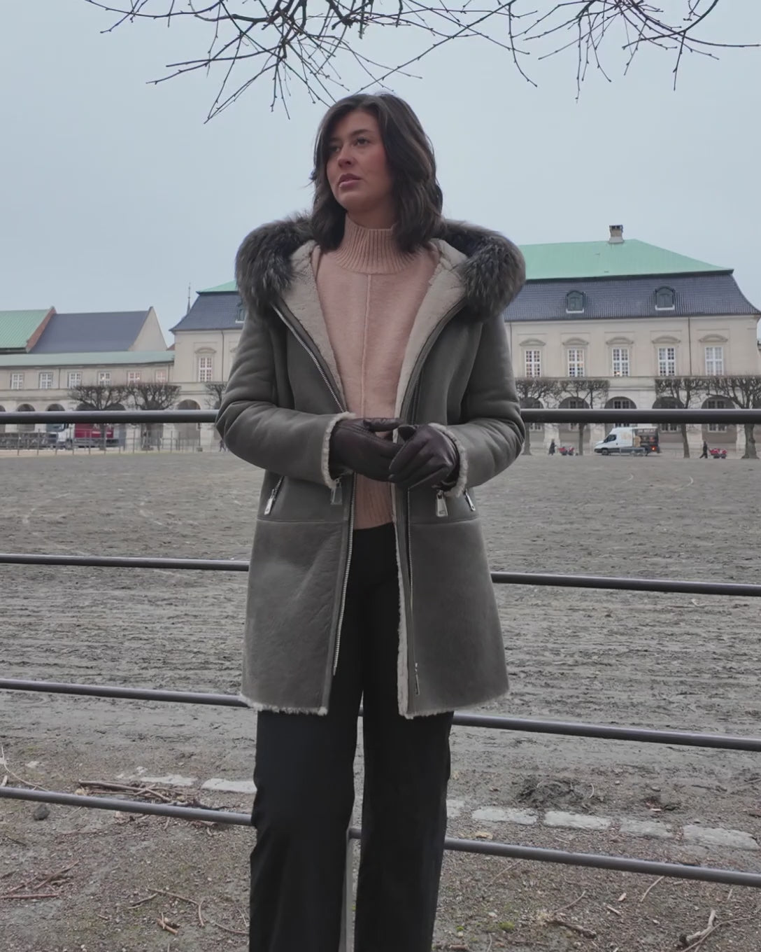 Gør dig klar til at vække opsigt med vores Abella shearling-lammeskindjakke. Med en hyggelig hætte og smarte lynlåse er denne jakke et must-have til efterår og vinter. Den luksuriøse vaskebjørns-pelskant tilføjer et strejf af elegance. Hold varmen og se stilfuld ud i den mørkebrune, varme Rulam -lammepels jakke.