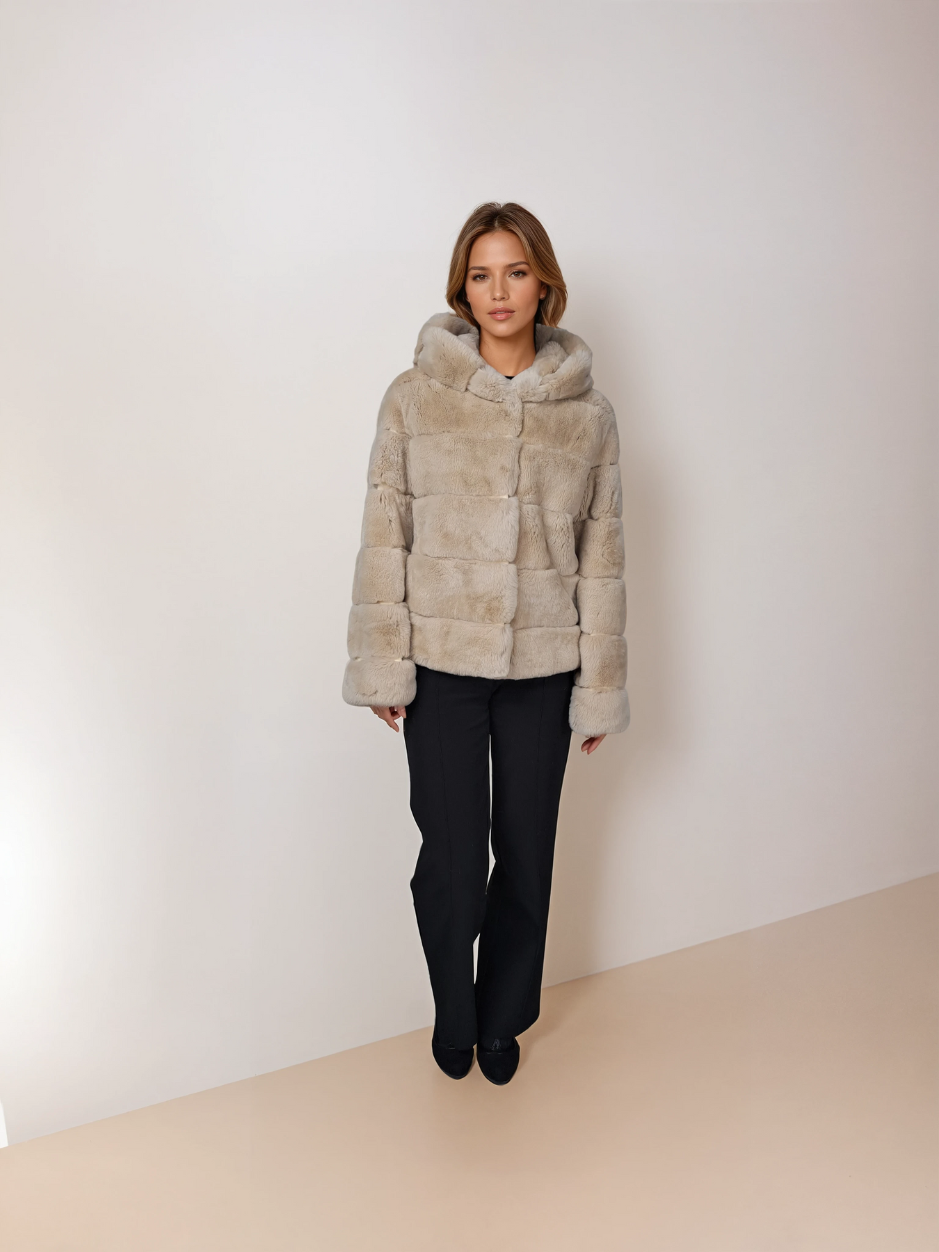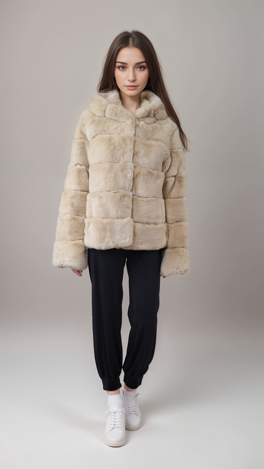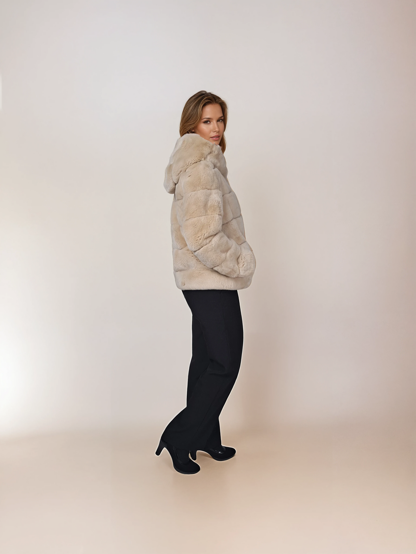 Stampe Danmark introducerer Petrovski, 60 cm., hætte Rex frakke til kvinder i cremefarvet – en perfekt blanding af pænhed, klassisk stil og sporty sofistikering. Denne korte frakke er lavet af smuk sort rex kaninpels og er designet til at holde dig varm hele vintersæsonen.
