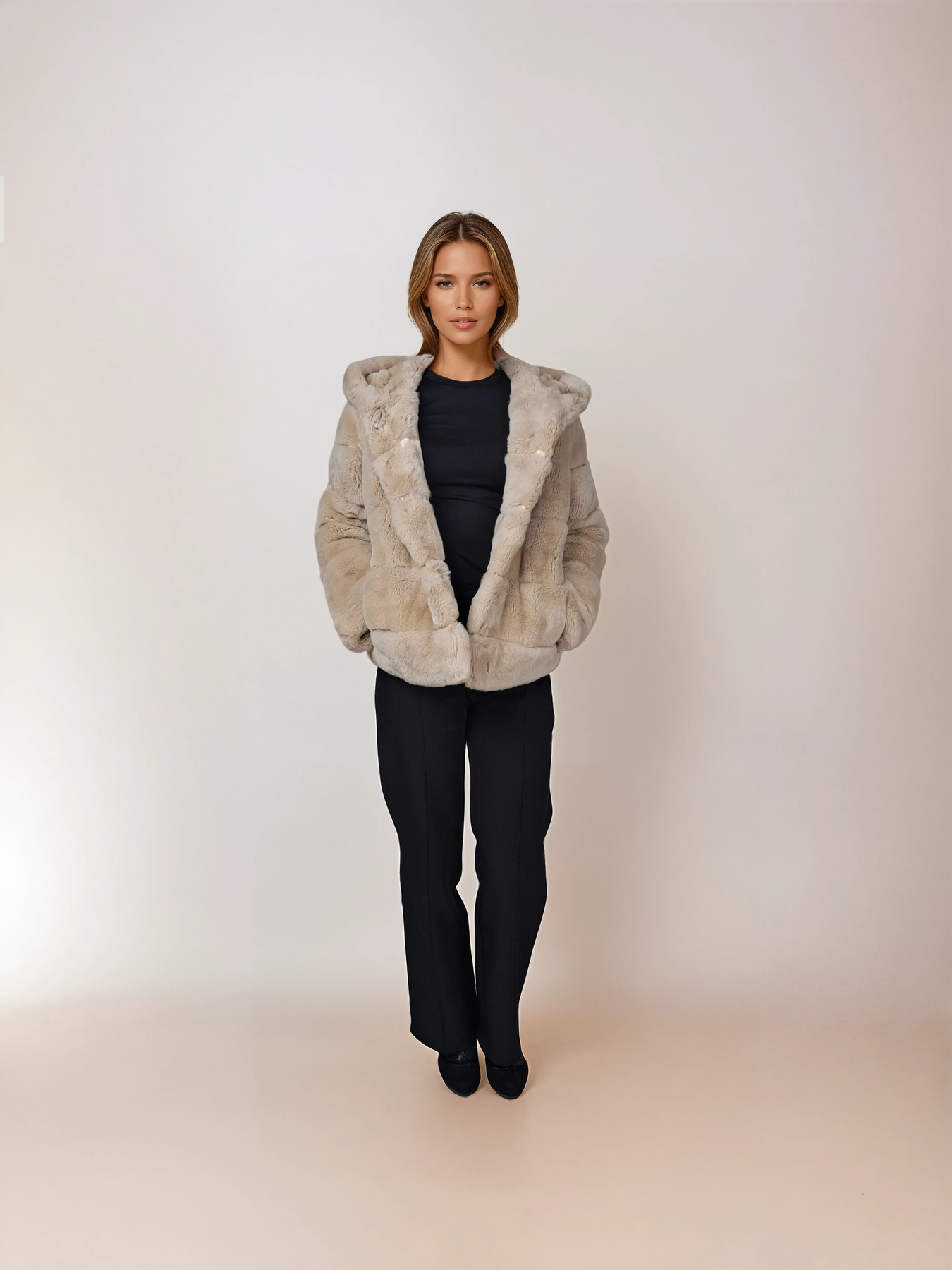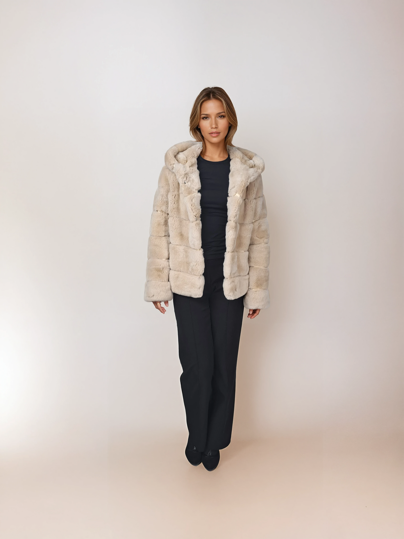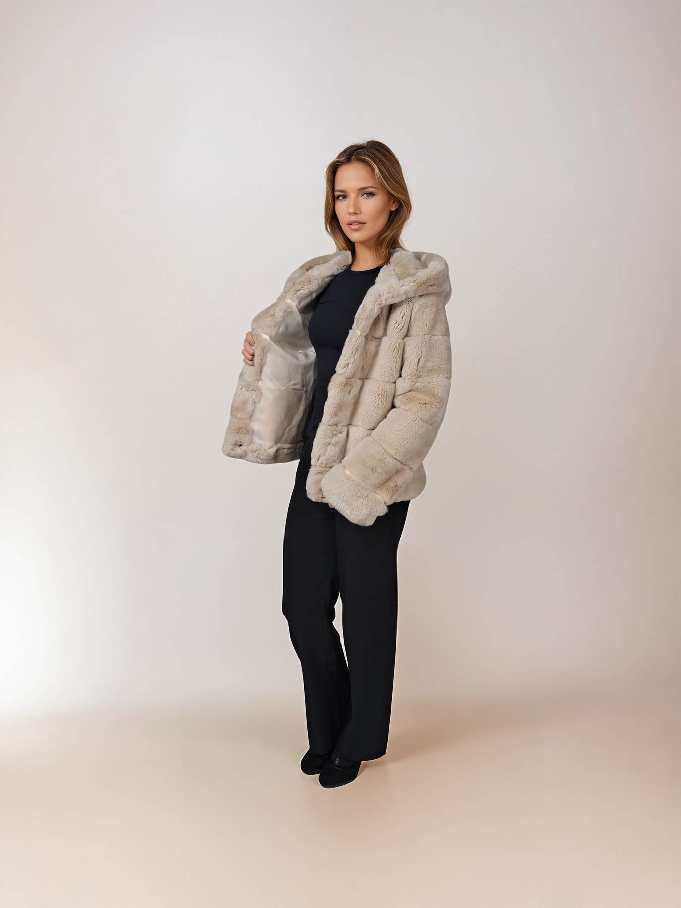 Stampe Danmark introducerer Petrovski, 60 cm., hætte Rex frakke til kvinder i cremefarvet – en perfekt blanding af pænhed, klassisk stil og sporty sofistikering. Denne korte frakke er lavet af smuk sort rex kaninpels og er designet til at holde dig varm hele vintersæsonen.