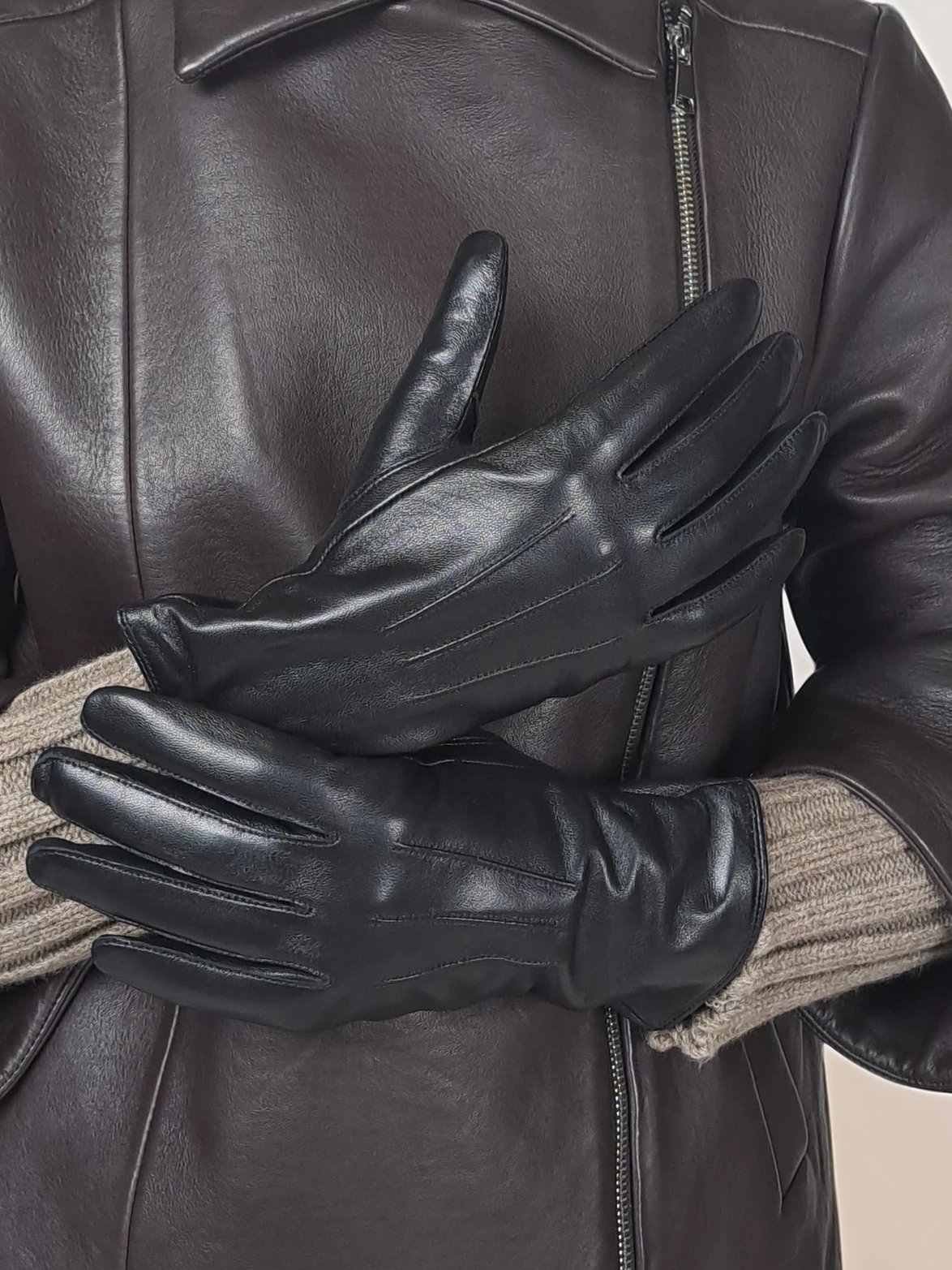 Lyft din vintergarderob med dessa raffinerade läderhandskar gjorda av smidigt lammskinn. Designade för den kräsna kvinnan, har de responsiv touch-teknik som håller dig ansluten till dina enheter utan att ta av handskarna. Det lyxiga fodret blandar 70 % ull med 30 % akryl för exceptionell värme och komfort under hela säsongen. Expert gjord av Levinsky, dessa tidlösa svarta handskar kombinerar klassisk elegans med modern funktionalitet.