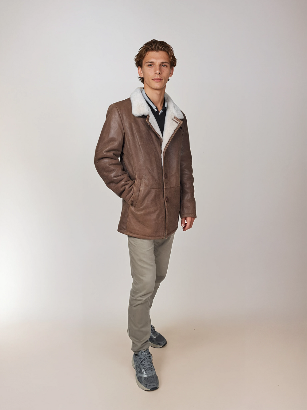 Whiskyfärgad klassisk shearling-päls från Levinsky med vit päls på insidan. Prova känslan av silkeslen päls och den lätta vikten. Din kropp kommer att andas fritt genom pälsen och fodret av acetat. Den fina kragen är vacker när den är öppen men kan också stängas för din komfort när det blir kallt.